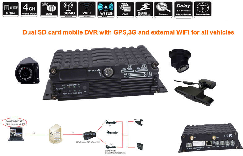 4ch 3G WIFI GPRS Dual SD GPS Mobile DVR Tracking With H.264 Video Compression