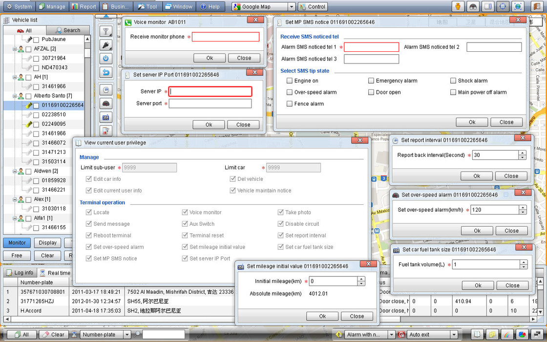 1. cada veículo detalhou dados 2. O veículo podia ser distribuído entre usuários gerais pelo usuário super 3. Todos os parâmetros do veículo podiam ser configurados e controlado junto 4. Há uns ícones diferentes dos veículos para a seleção, e nós podemos adicionar ícones novos como os clientes exigiram 5. Na lista do veículo, mostra a cada um o estado do tempo real do veículo |