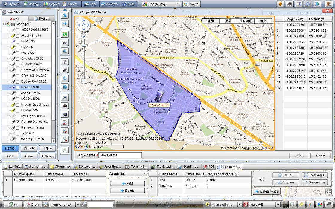Dê a observação quando os veículos vão em ou para fora área diferente 1. Geo-cerca da forma do apoio vária: a. Redondo retângulo do B. polígono do C. linha quebrada do D. 2. A cerca eletrônica pode ser ajustada para a estação, o acesso do veículo à gestão de estação. 3. |